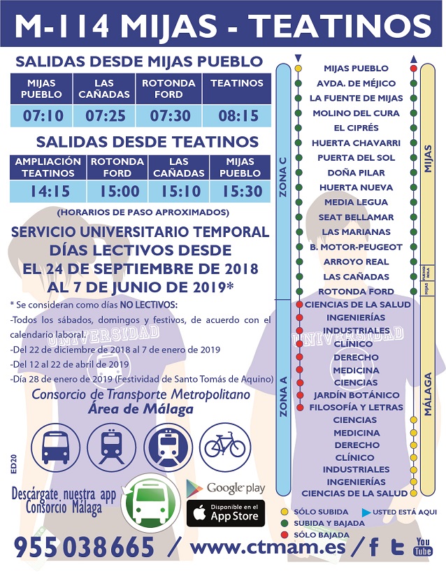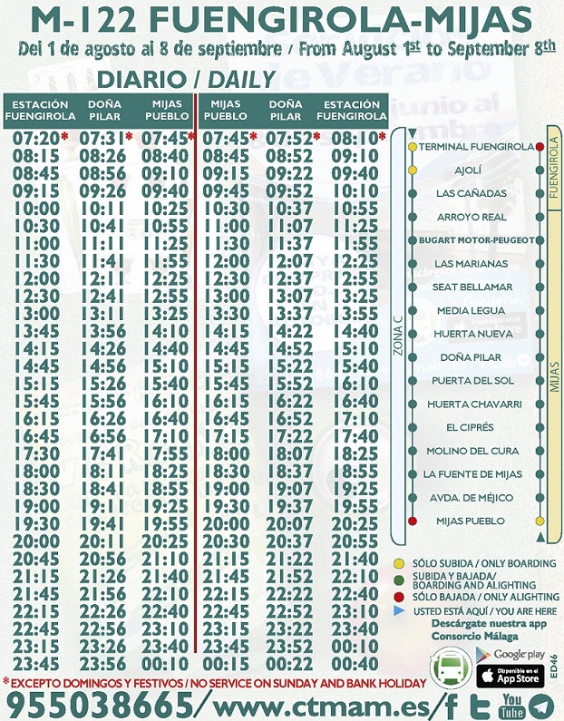 Línea Trayecto Recorrido y horarios Plano BUS Entrerríos - Ford - Barrio Santana Recorrido M-114 Mijas-Teatinos Recorrido y horarios Plano M-122 Fuengirola-Mijas Recorrido y horarios Plano M-127 Las Lagunas-Estación de Autobuses Recorrido y horarios Plano Fiestas